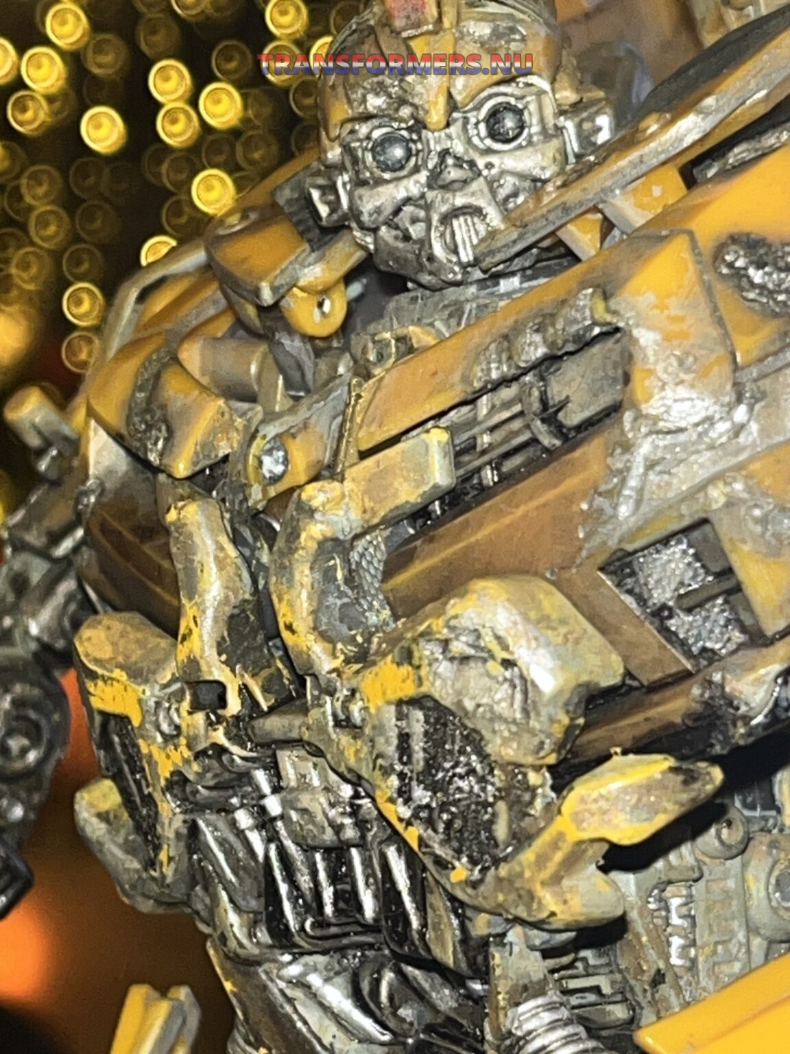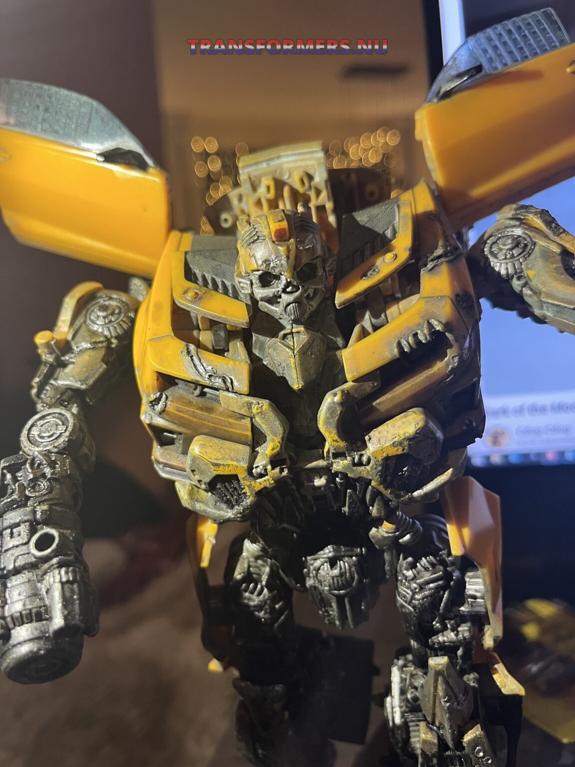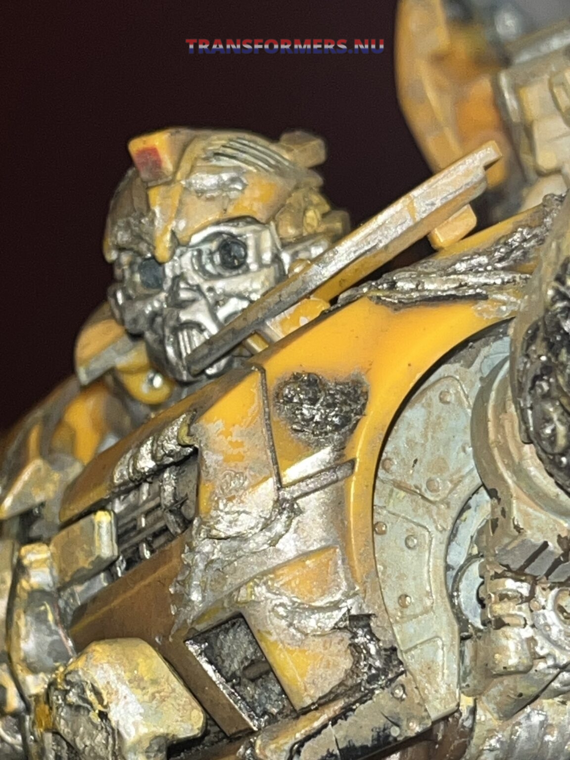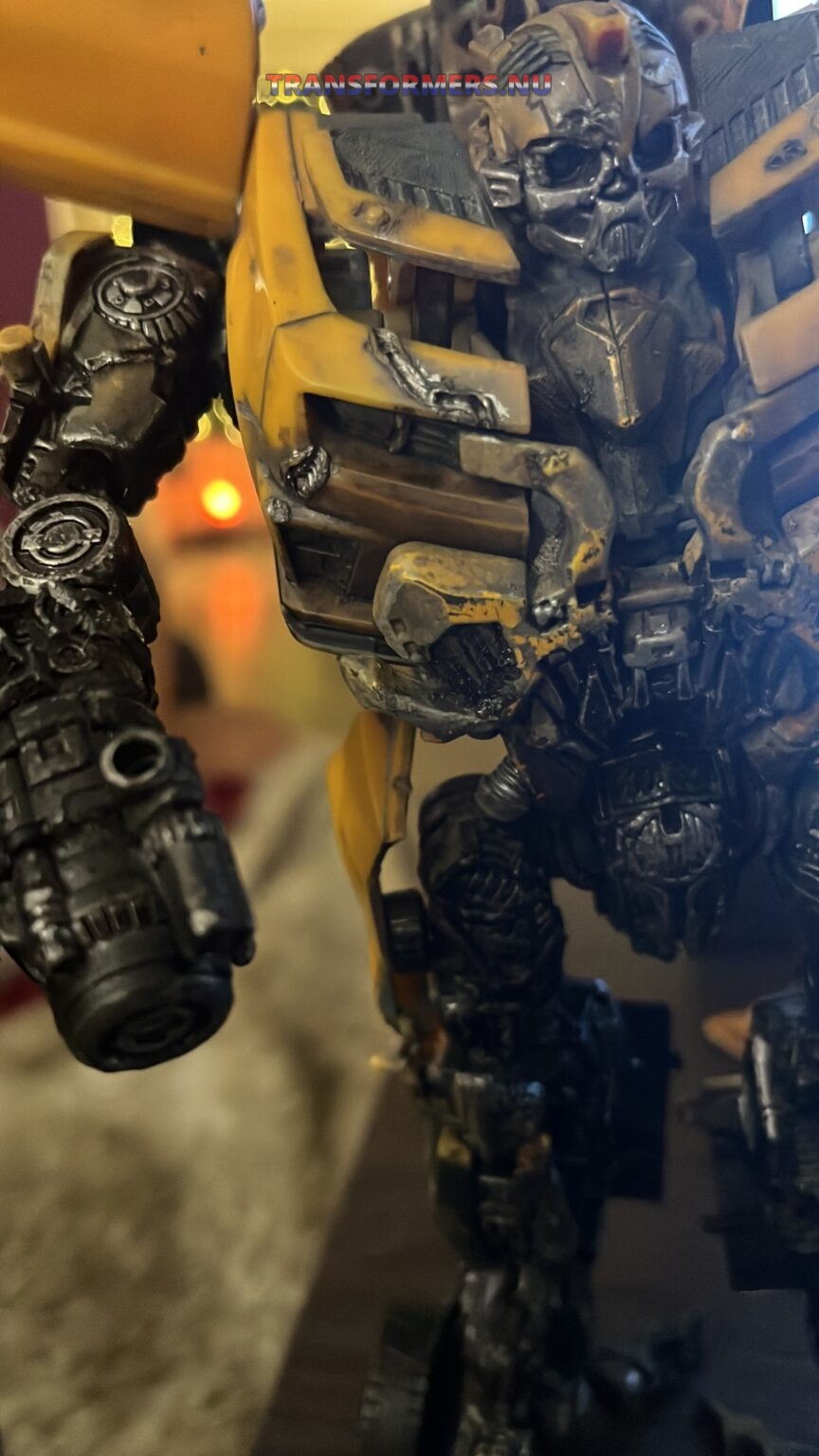 na lange tijd heb ik dit gevonden, geen van de modellen leek op deze. Na een tijdje heb ik op wat details gelet, eerst specifiek twee strepen op het dak, daarna de manier hoe de grill combineerd met het borst deel. Dit model “DOTM MechtechLeader Bumblebee” komt overeen hoe mijn bumblebee transformeert, deze heeft niet dezelfde battledamage. Ik kan niets vinden wat zo gehavend is en ook zo gedetaileerd. Eerder dacht ik dit een custom was, iemand heeft dit zelf gedaan, maar dan wel heel, heel erg goed. Iemand een idee? Het transformeren gaat stroef en het lijkt dat het model nog redelijk nieuw is. Ik was zo onder de indruk, naar mate ik hem meer als bot had getransformeerd, werd ik steeds meer verrast. Wat een gedetaileerde bot, en heel possable. veel groter dan ie is als camaro.