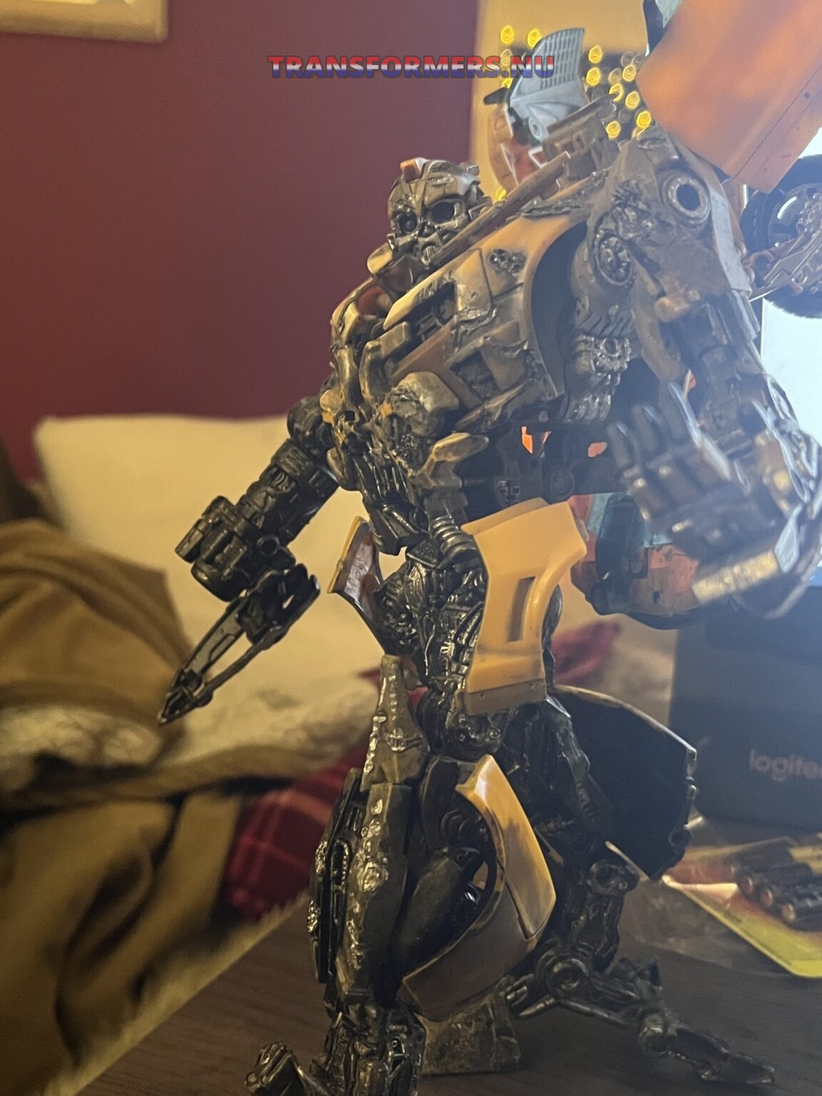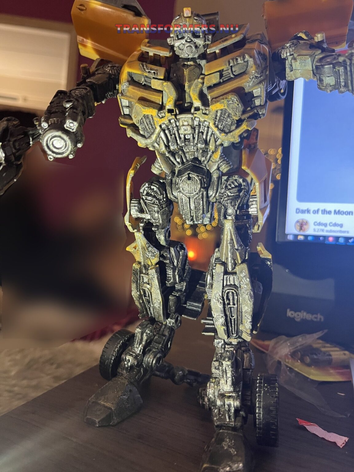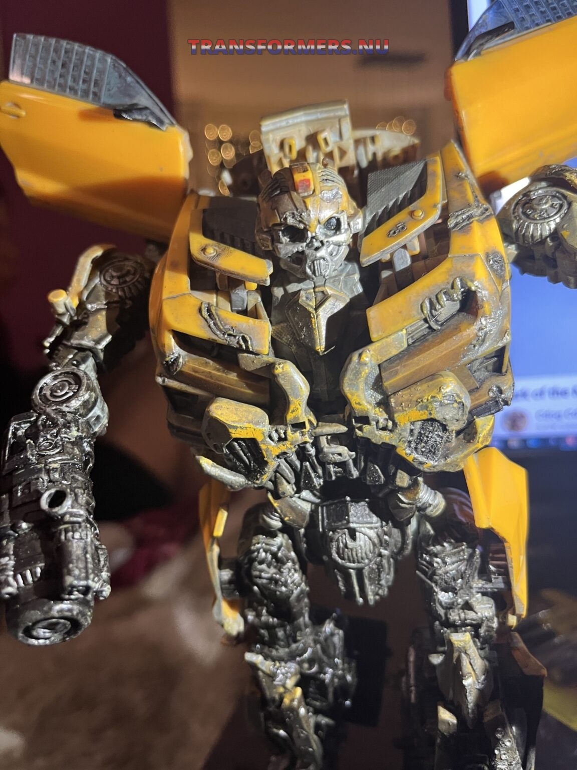 na lange tijd heb ik dit gevonden, geen van de modellen leek op deze. Na een tijdje heb ik op wat details gelet, eerst specifiek twee strepen op het dak, daarna de manier hoe de grill combineerd met het borst deel. Dit model “DOTM MechtechLeader Bumblebee” komt overeen hoe mijn bumblebee transformeert, deze heeft niet dezelfde battledamage. Ik kan niets vinden wat zo gehavend is en ook zo gedetaileerd. Eerder dacht ik dit een custom was, iemand heeft dit zelf gedaan, maar dan wel heel, heel erg goed. Iemand een idee? Het transformeren gaat stroef en het lijkt dat het model nog redelijk nieuw is. Ik was zo onder de indruk, naar mate ik hem meer als bot had getransformeerd, werd ik steeds meer verrast. Wat een gedetaileerde bot, en heel possable. veel groter dan ie is als camaro.