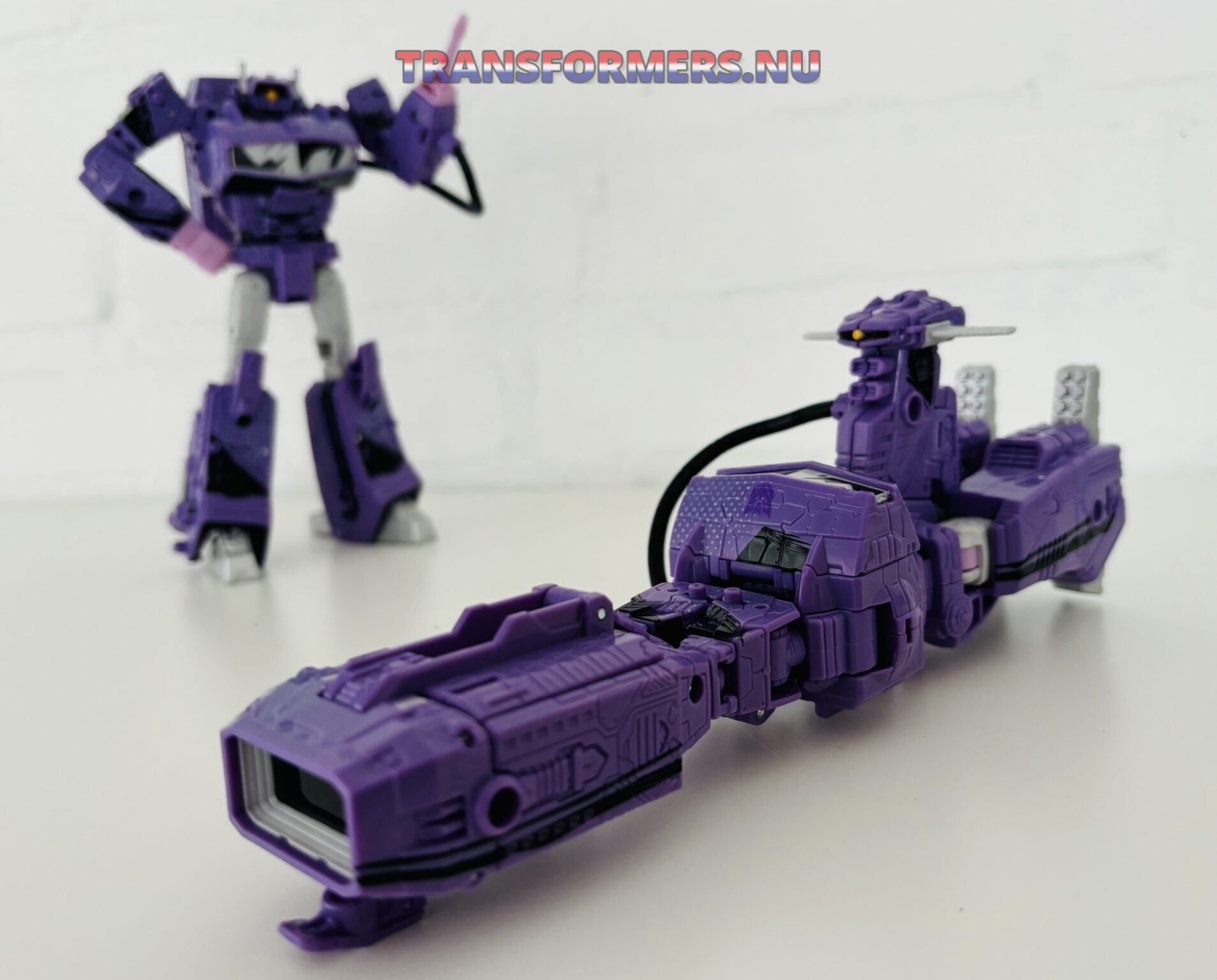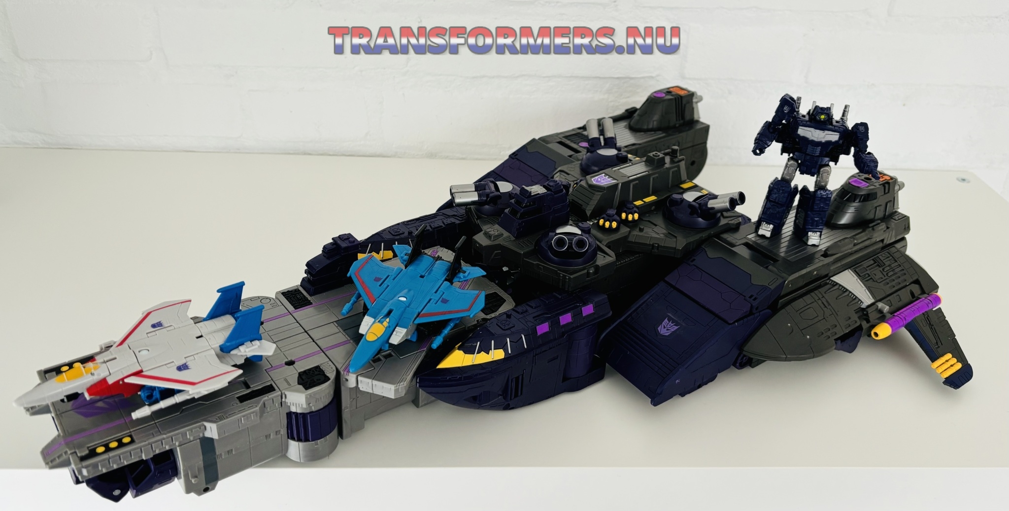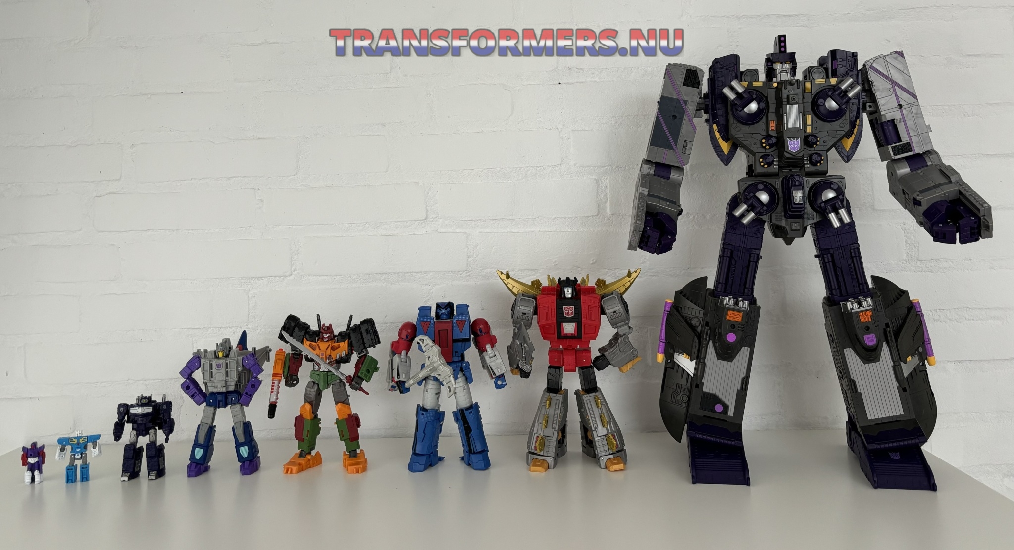 Van links naar rechts: Sunbeam (targetmaster), Eject, Shockwave (core class), Needlenose (deluxe class), Bludgeon (voyager class), Straxus (leader class), Snarl (leader class) en Tidal Wave (titan class).